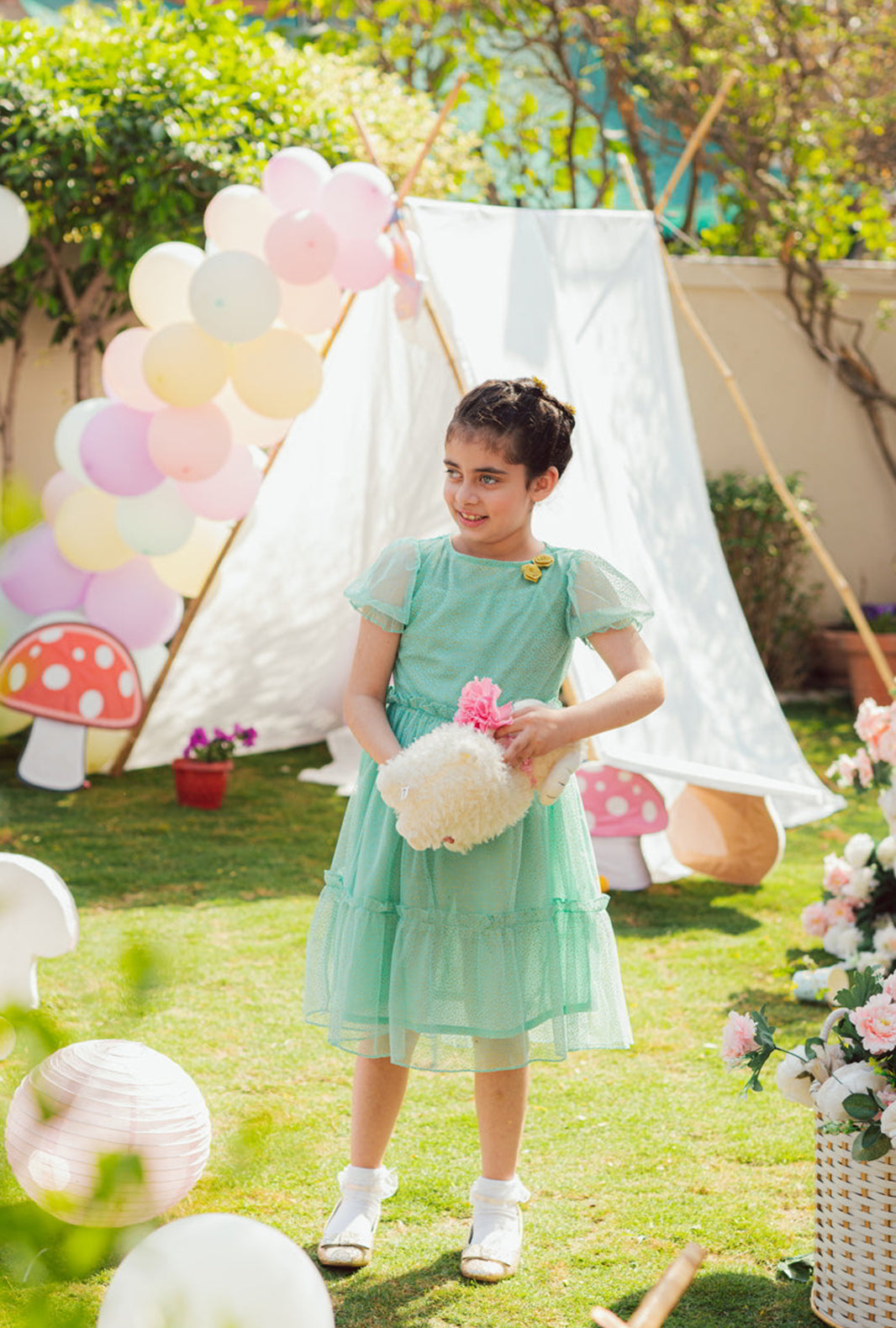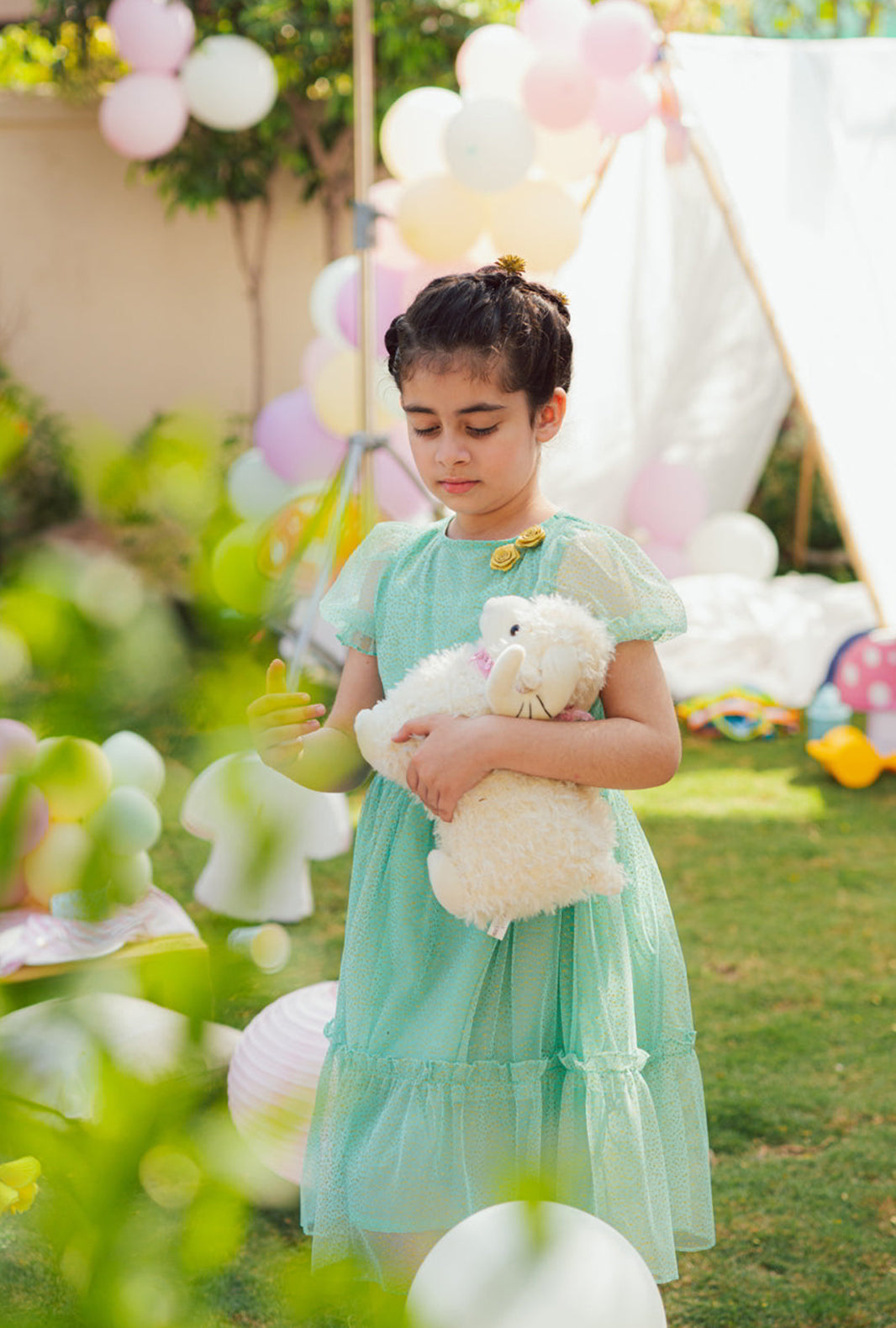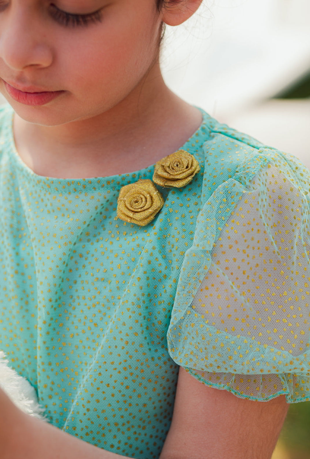 Her summer parties and formal events are covered with this beautiful Aquamarine& Gold speckled dress. Designed to make her the star of the show, the iridescent tulle is comfortably lined with cotton and features a rounded neckline adorned with sparkling gold rosettes on the front. The dress has stylish puffed princess sleeves with delicate frills. Our Aquamarine dress has a gorgeous silhouette that is built from multiple layers of cascading gold speckled tulle, creating a glamorous outfit for fashion-loving girls. It opens at the back with a hidden zip for maximum comfort.