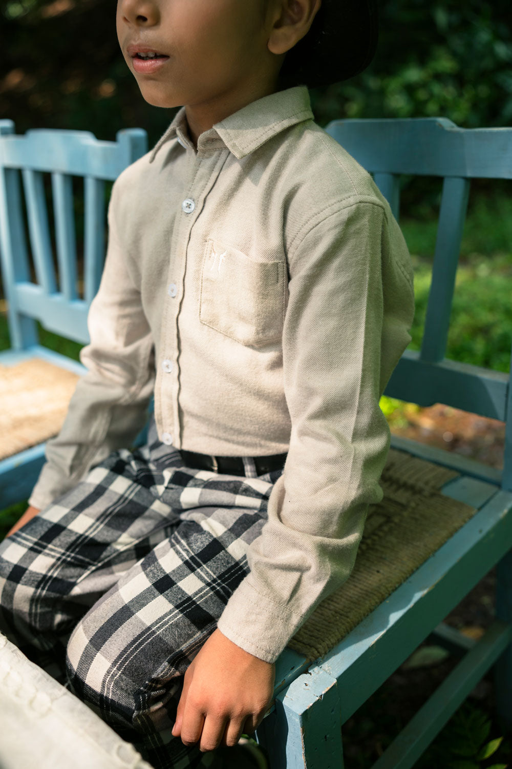This season, we're focused on bringing to you the classics that would become a style staple in your children's wardrobes and can be passed on to siblings! This super soft and warm shirt for formal engagements has just the kind of classic look we're talking about. Crafted with great care and love, the front open, button down shirt is imagined in a gentle beige colour in a woollen fabric. It features a straight point collar and a left sided front pocket, which proudly carries our logo embroidered in monochrome beige silk thread. Pair it with our formal checkered woollen pants for this old school charm ensemble.