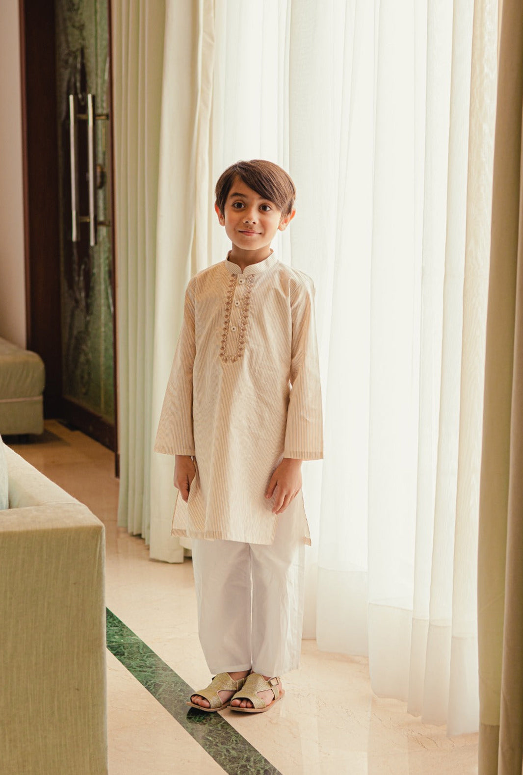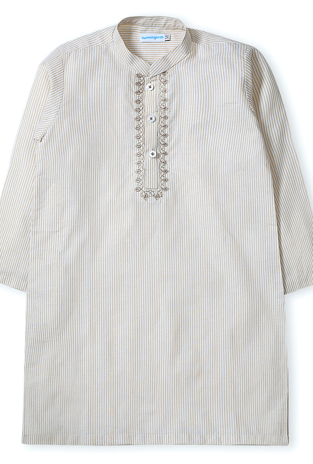 Our Beige & White Striped kurta is a very smart and versatile piece. It's been made with a very fine textured cotton lawn & and features delicate embroidery in earth tones along the neck and placket. It can be paired with several different waistcoats from our collection or worn on its own. Ideal for festive & formal events.