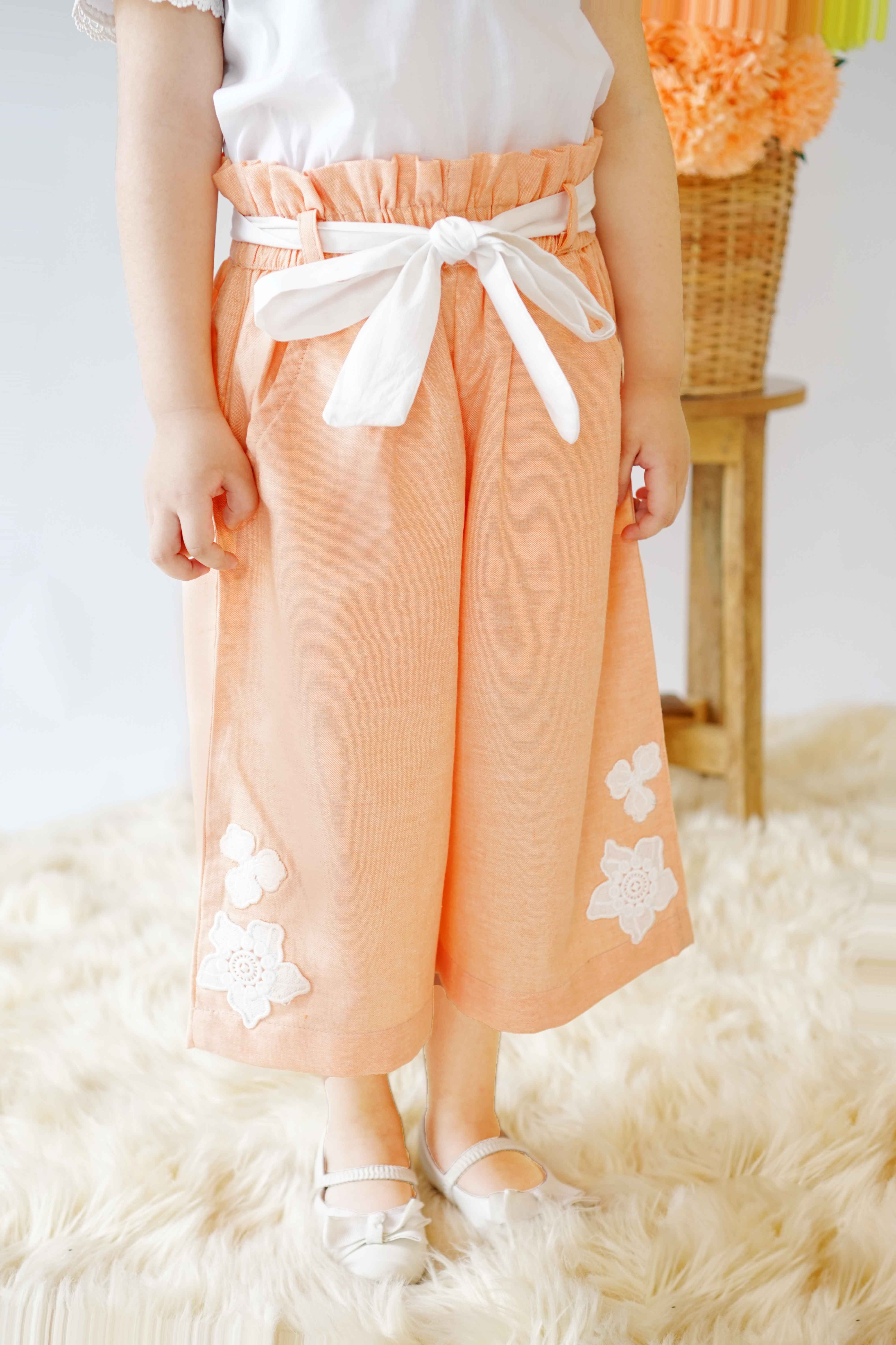 Designed in a playful block colour, this pair of high waisted cropped pants are made from lightweight cotton chambray for effortless wearability. The frilled & elasticated waistband features a cream coloured belt tied in a bow in the front while the hem of the pants are decorated with creamy white lace and crochet flowers appliquéd delicately. Let your little fashionista style them with everything from our blouses to tees and watch as they smile all summer long.