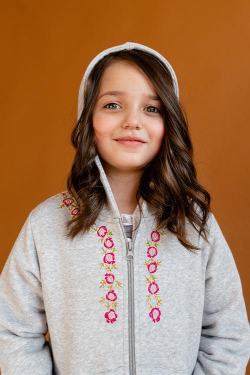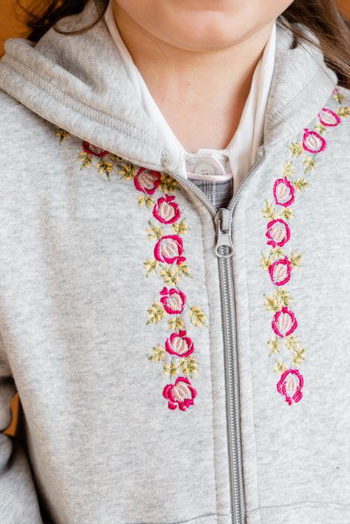 Such a tiny size, but so much pizazz. Constructed from soft pure cotton fleece, this lovely Grey Hoodie features a delicate floral embroidery on the front in animated shades of pink. Pair it with our Harbour Grey sweatpants and keep her snuggled up in this adorable number all winter long!