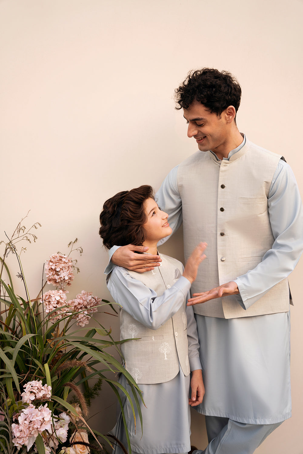 Our Eid Edit this year presents is lovely garden inspired blooming floral and orchids prints and colours in bringt cheerful hues! That is exactly what inspired us to create our Tree of life style this festive season. As dreamy as its name, this Waistcoat is crafted in soft grey cotton chambray fabric and lined with soft silk, the outfit features ivory wooden buttons.