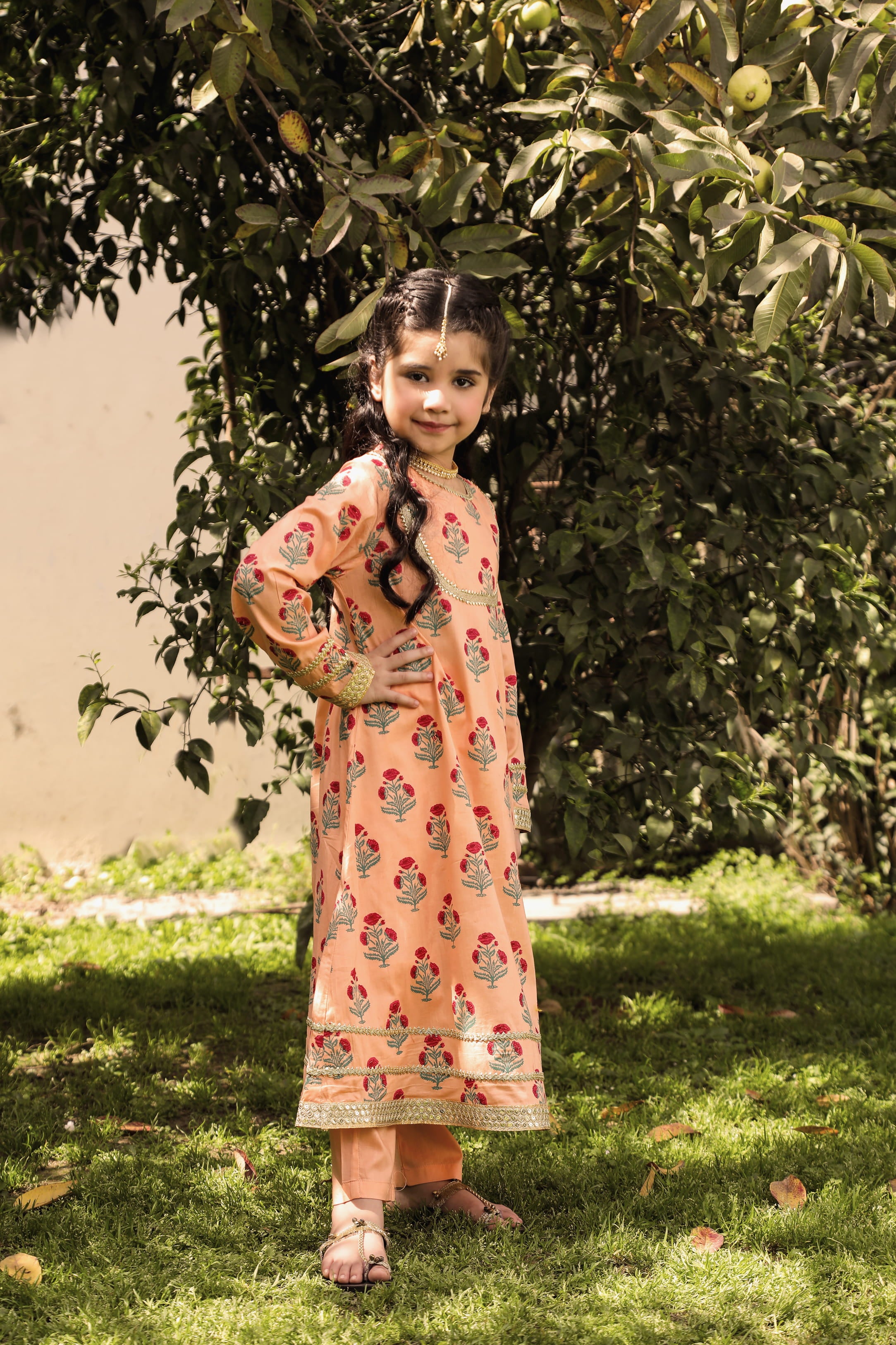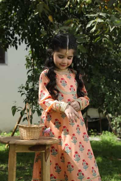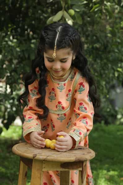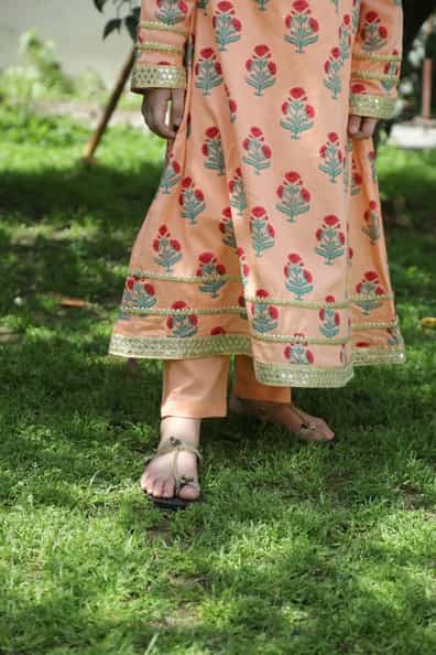 We want to take you back in time to the Mughal Empire and their beautiful gardens. This stunning waistcoat features small bouquets of red rose block printed on a peach coloured cotton lawn fabric. It is accented with wooden buttons and lined with fine silk.