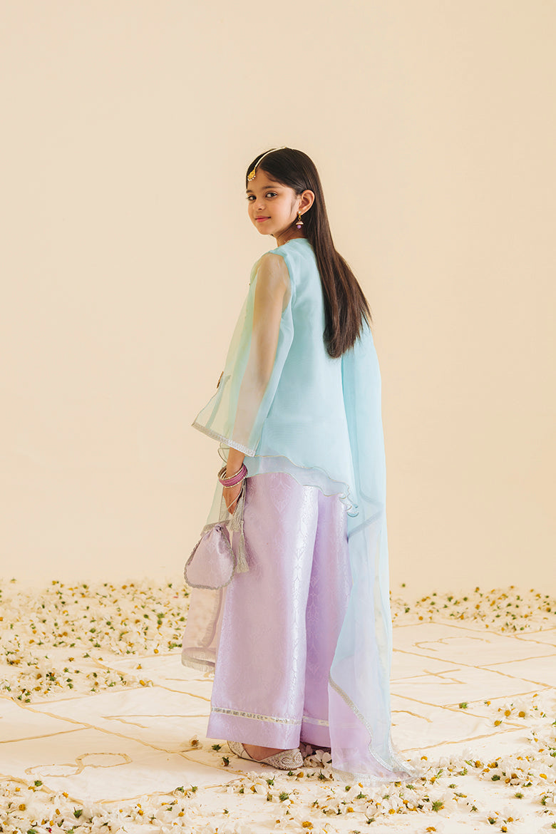 The short, diagonally cut shirt pairs elegantly with lilac and silver jamawar A-line pants, adorned with silver ribbons for a polished finish. A beautifully crafted two-toned tissue dupatta in lilac and blue, with silver finishing, completes the ensemble. To make it extra special, a matching pouch purse is included—perfect for collecting eidi!