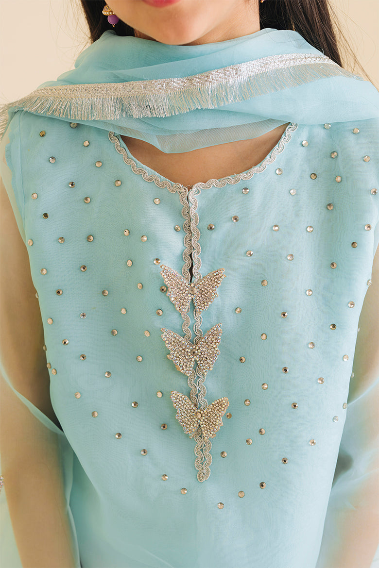 Designed in soft pastel shades of lilac and sky blue, this outfit is crafted from luxurious tissue and jamawar fabrics. The stylish diagonally cut shirt features two layers, enhanced with delicate silver thread embroidery, shimmering diamanté butterflies, and tilla thread-accented lace details on the front and back. A dusting of diamonds on the bodice adds a touch of sparkle, making this a standout festive look.