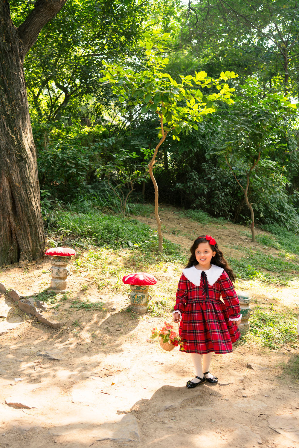 Our A/W '24 'The Magical Tree' Collection is an amalgamation of the most popular and inspiring children's storybooks and their beloved characters. Heidi's Tartan Dress is inspired by the famous book character, and the look is impeccable! Whether it’s for a casual event or a formal engagement, this dress is destined to become an absolute favourite. If the lace trimmed doll collar isn’t enough to confirm its must-have status, its charming tartan trim and black buttons with a matching black ribbon bow just might! The full sleeves with delicately Smocked cuffs are adorned with laces and add a graceful finish to the whole outfit.