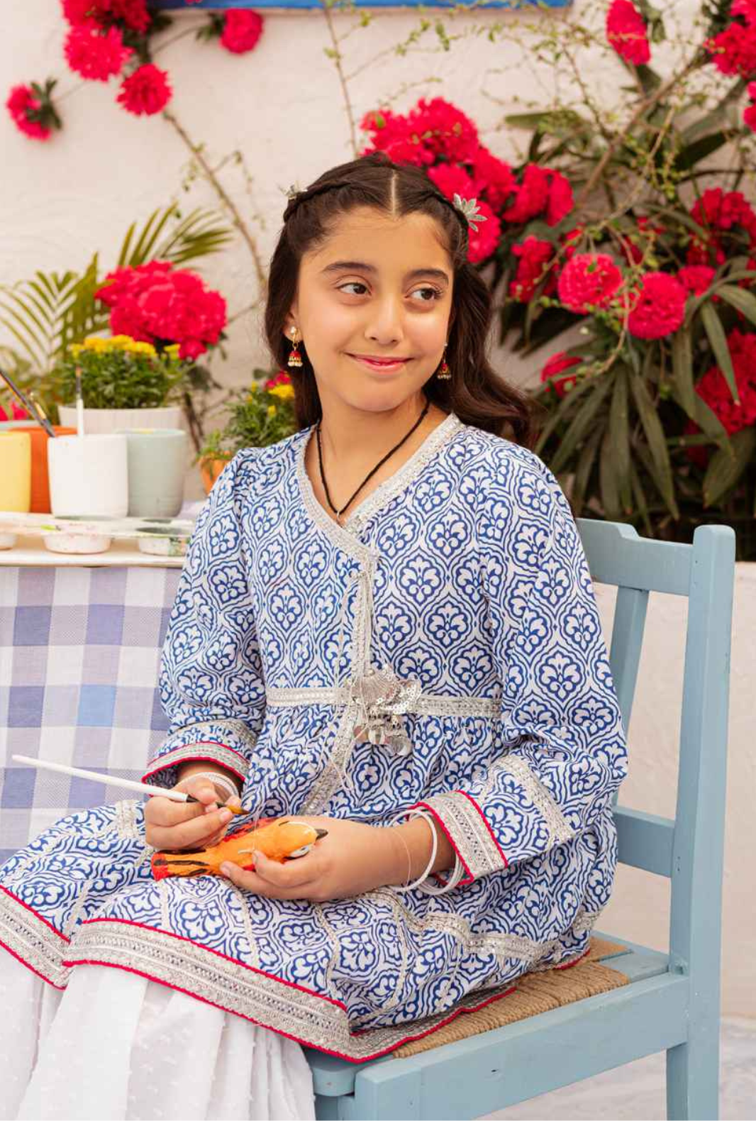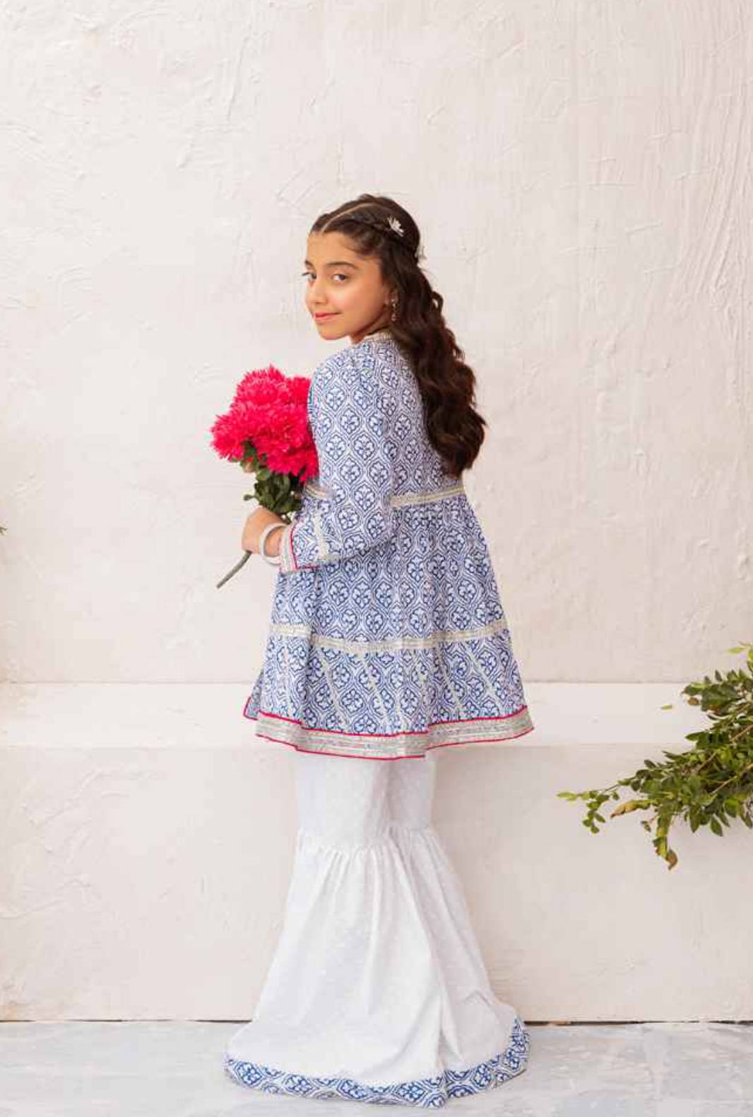 The Gharara is imagined in a soft cotton lawn Brosha fabric in bone white color, finished with a blue and white printed hem. The look is completed with a matching blue and white dip dyed crushed cotton dupatta. This stylish and vibrant outfit is sure to create beautiful memories for your little girl this year!