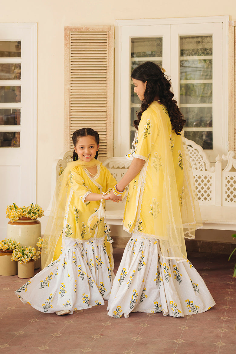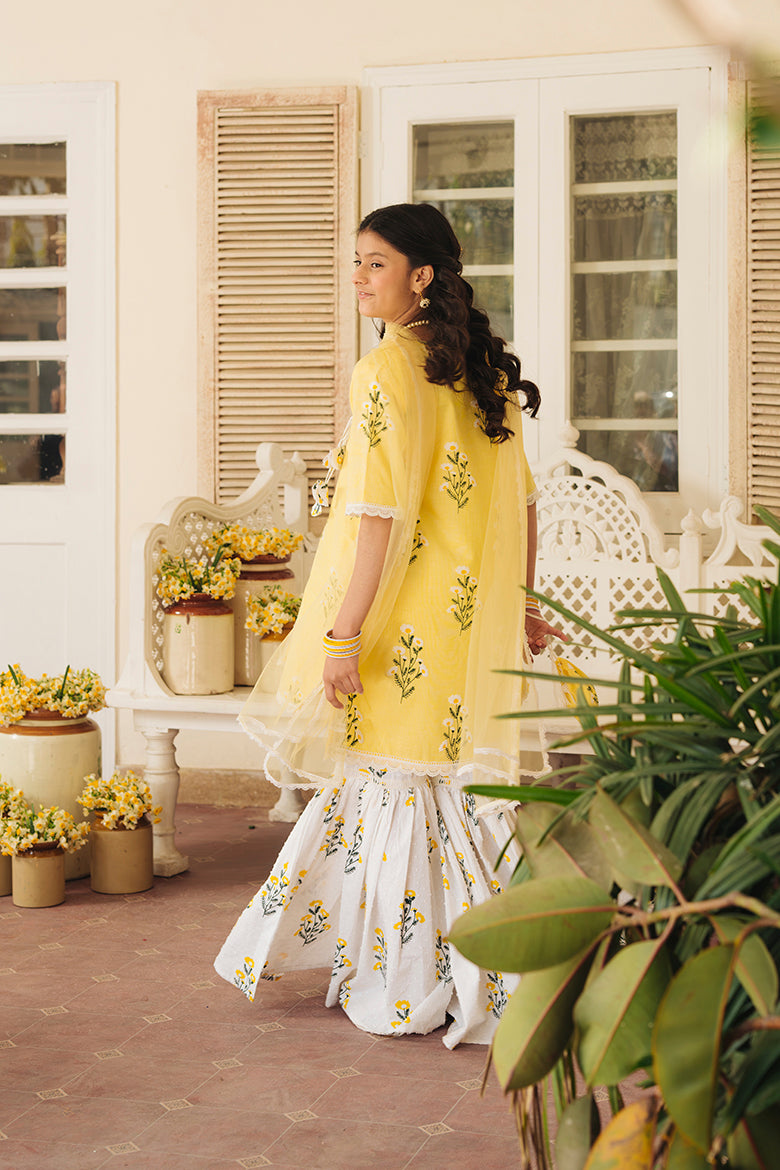 The flowy white gharara, made from soft Swiss voile brosha lawn, showcases a bright yellow daffodil block print with a graceful white lace trim at the hem. A coordinated pouch purse is included, perfect for collecting Eid treats. Completing the look is a vibrant yellow tulle dupatta, edged with white crochet lace for a delicate, ethereal finish.