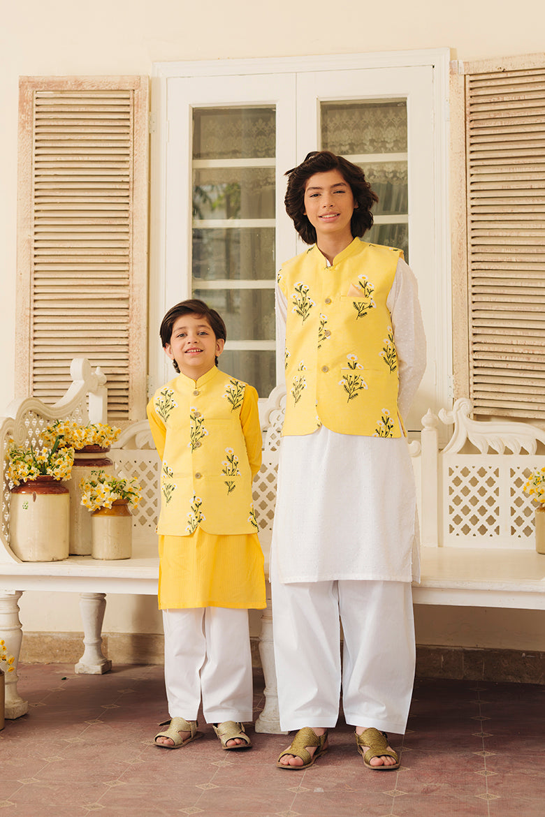 Spring in Pakistan is synonymous with lovely gardens flourishing with blooming flowers and orchids in bringt cheerful colours! That is exactly what inspired us to create our Jaan-e-Bahar style this Spring/Eid season. As dreamy as its name, this Waistcoat is crafted in a mid yellow cotton chambray fabric and lined with soft silk, the outfit features wooden buttons.
