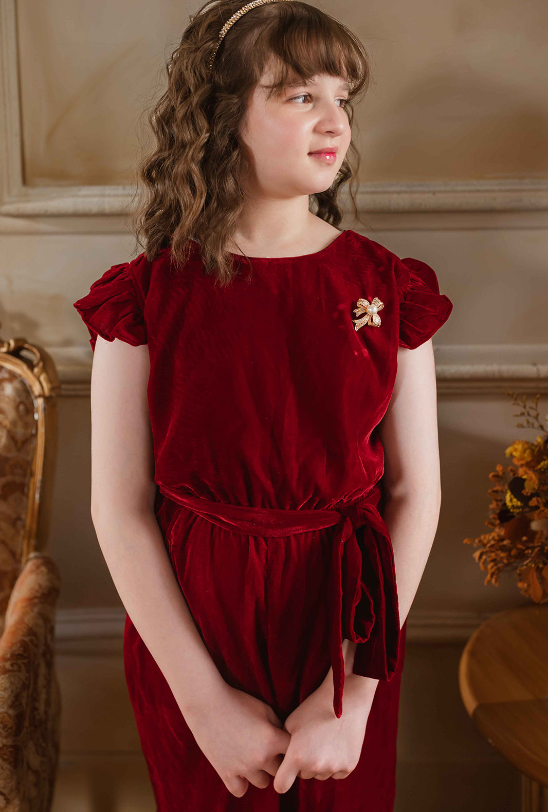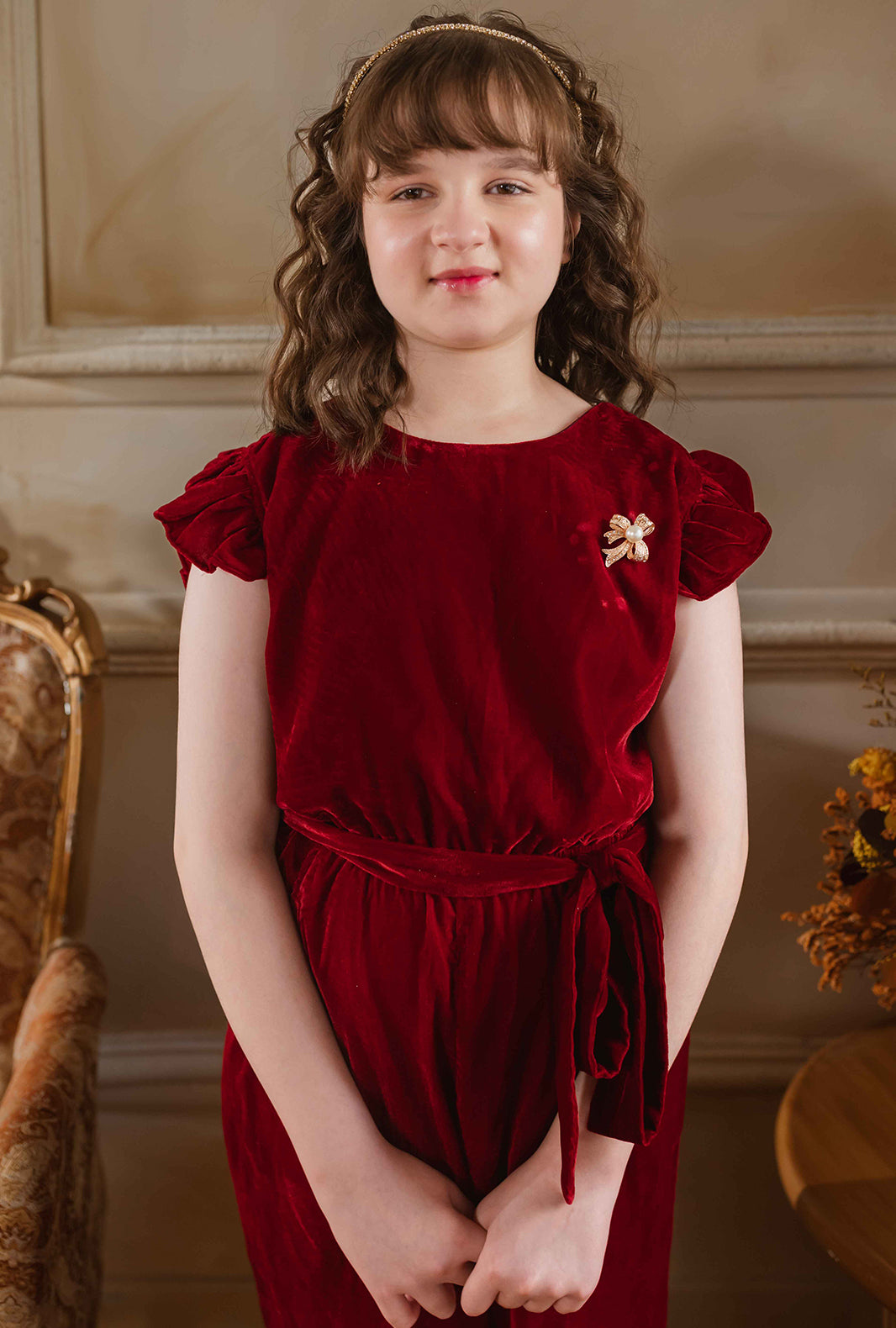 It's time to Party!! Get ready for seasonal celebrations with this fabulous and plush Maroon velvet jumpsuit, showcasing a stand out over the shoulder, ruffle detail and an elasticated waist which boasts a velvet belt. The Star of the ensemble is the gold and pearl pin brooch adorning the top left shoulder for added pizzazz! This is surely a show stopping outfit for her!