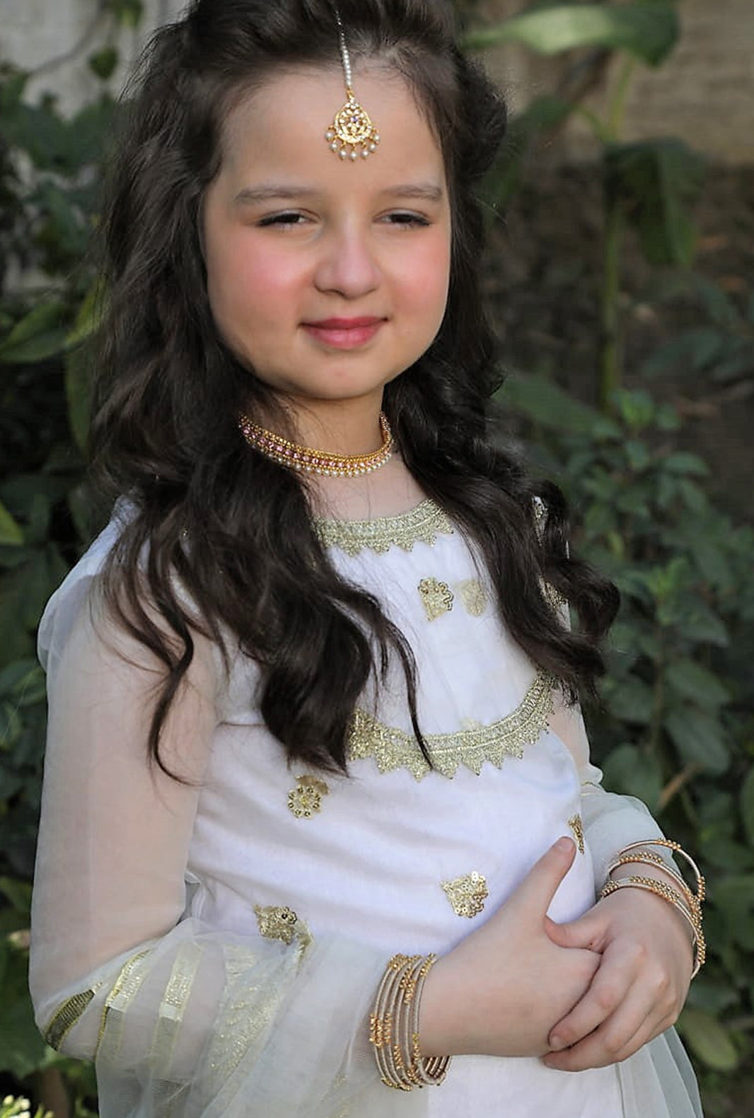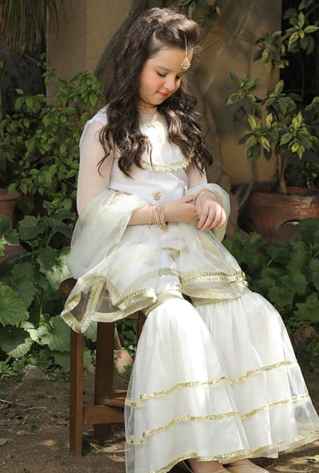 Let her be the Princess she really is! Our Motia Gharara Set is a dream come true for every little girl. Its a three piece ensemble, the Shirt is crafted with Pearly White Organza with gold embroidery and decorated with gold laces and goata.The gharara is imagined in soft White Tulle, accented with gold goata with three tiered lappa on the gathers and is and lined with cotton silk.The outfit is completed with a matching white tulle dupatta also edged with Gold laces. She'll dance and shine in this majestic outfit this Eid!