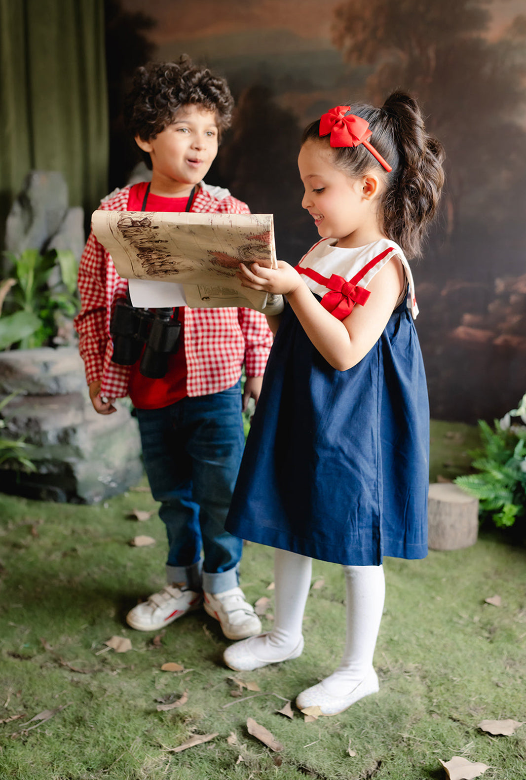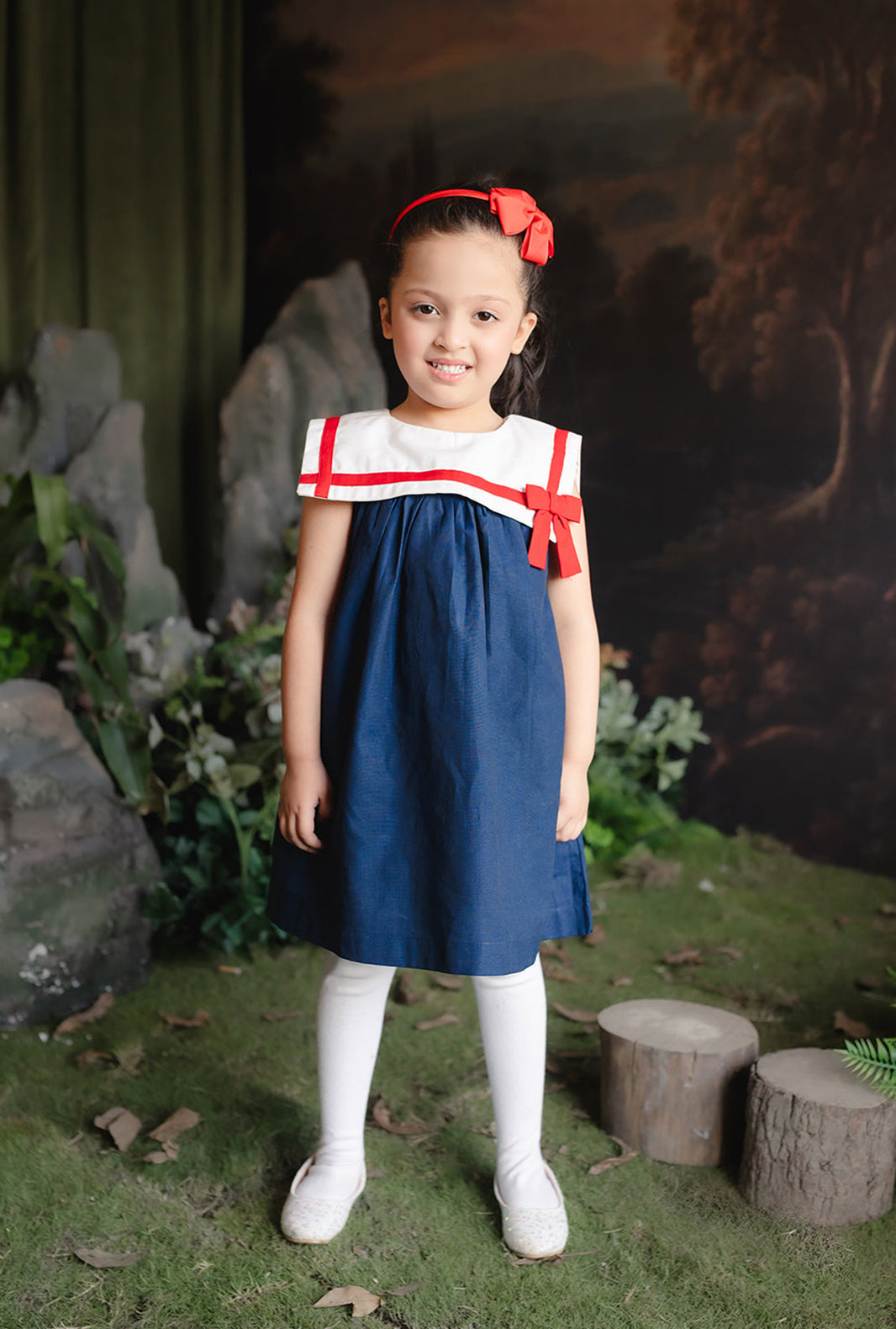 Little ones can make waves in our Navy Blue linen sailor dress - it would make the perfect style for the lovely autumn season! The dress features puffed full skirt, and a front and back white sailor collar trimmed with a stunning red ribbon finished with a pretty bow. The dress is fully lined in comfortable cotton and fastens at the back with a zip.