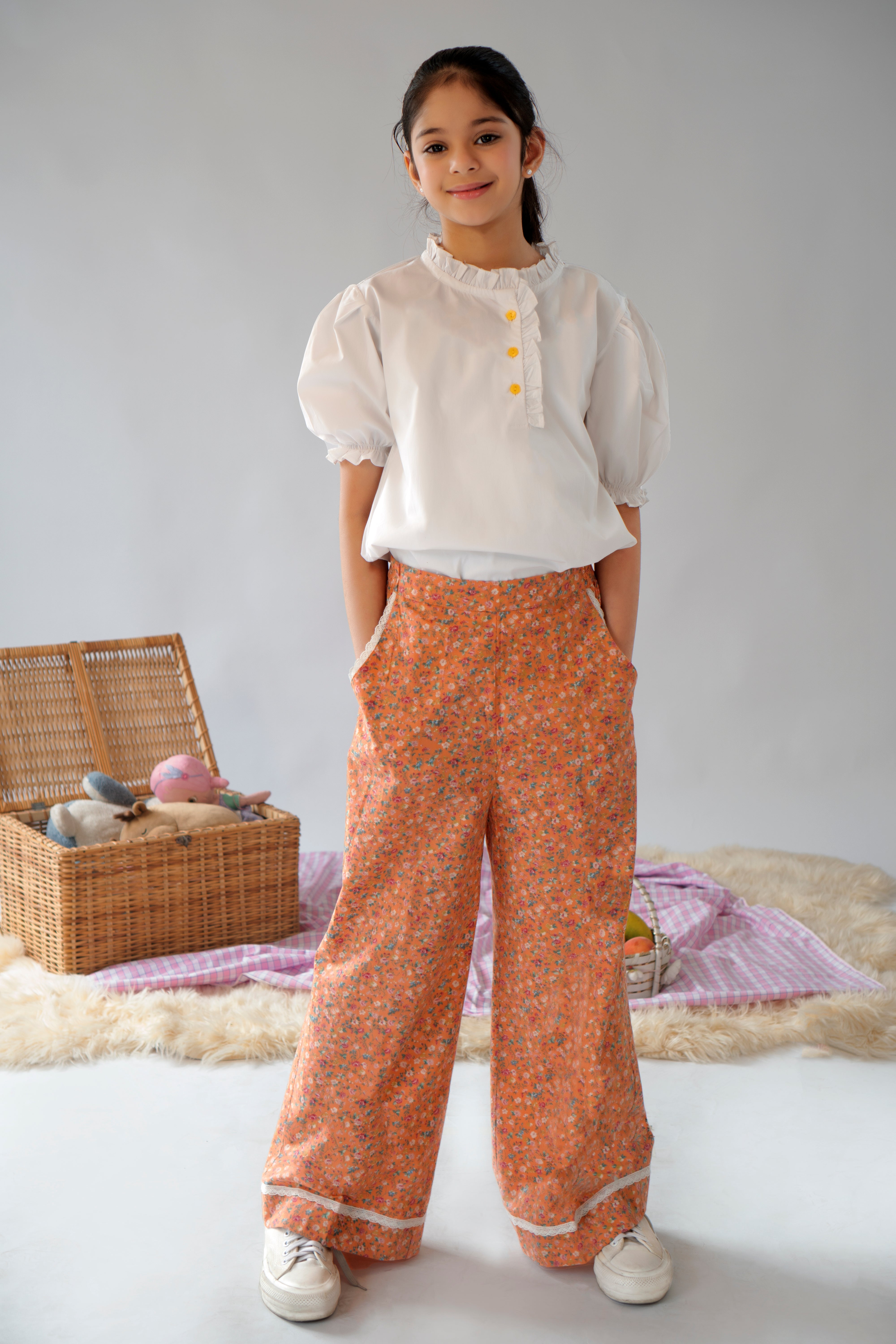Bright, carefree, and full of vintage charm — our Peach Meadow Pants are made for sunlit strolls, garden playdates, and cozy indoor lounging. Cut from soft, breathable cotton lawn, these wide-leg trousers feature an all-over ditsy floral print in warm peach tones, sprinkled with hints of blush, red, and sage.