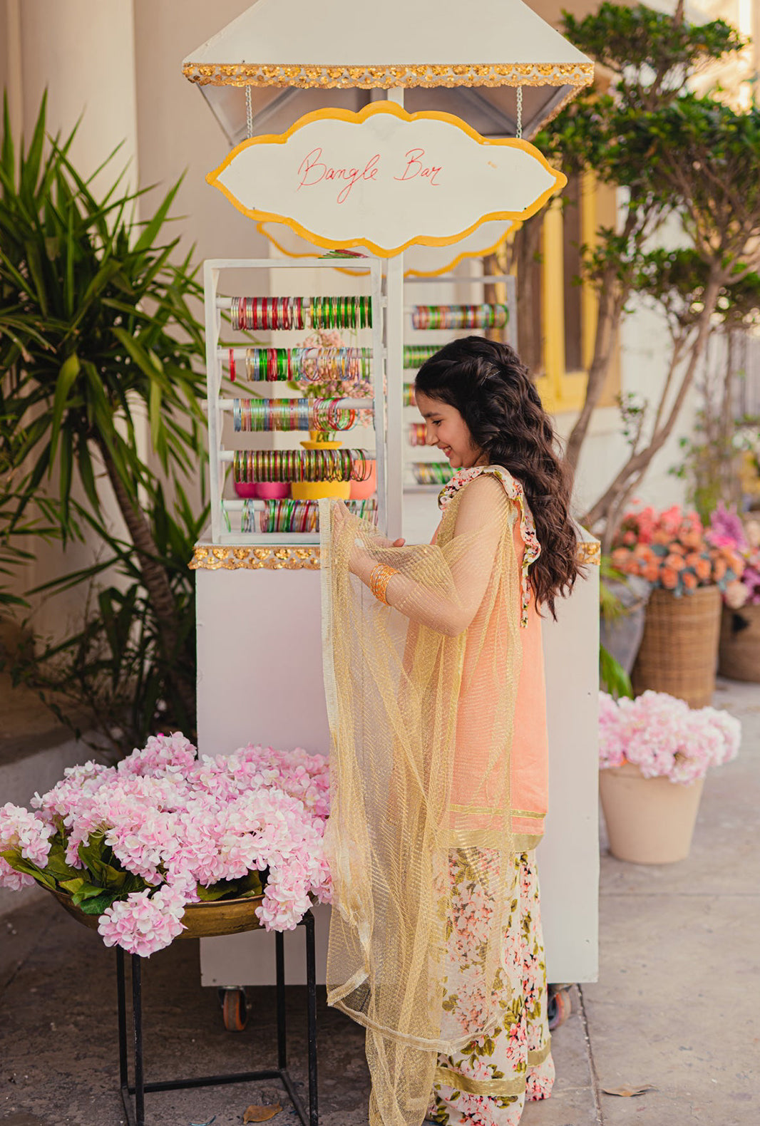 So pretty and dreamy! This two piece Sharara ensemble is ideal for Eid parties. The shirt is imagined in soft peach-coloured luxurious silk chiffon fabric woven with a gold thread, it features flowy gathers and frills on the shoulders in a floral printed lawn fabric. The shirt is decorated with gold ribbons along the neckline hem and sides. The shirt is lined with lawn for maximum comfort. The Sharara pants are crafted with a peach floral sofy lawn fabric and is finished with gold ribbons at the hem. This easy breezy Sharara suit is just what she needs in her festive wardrobe!