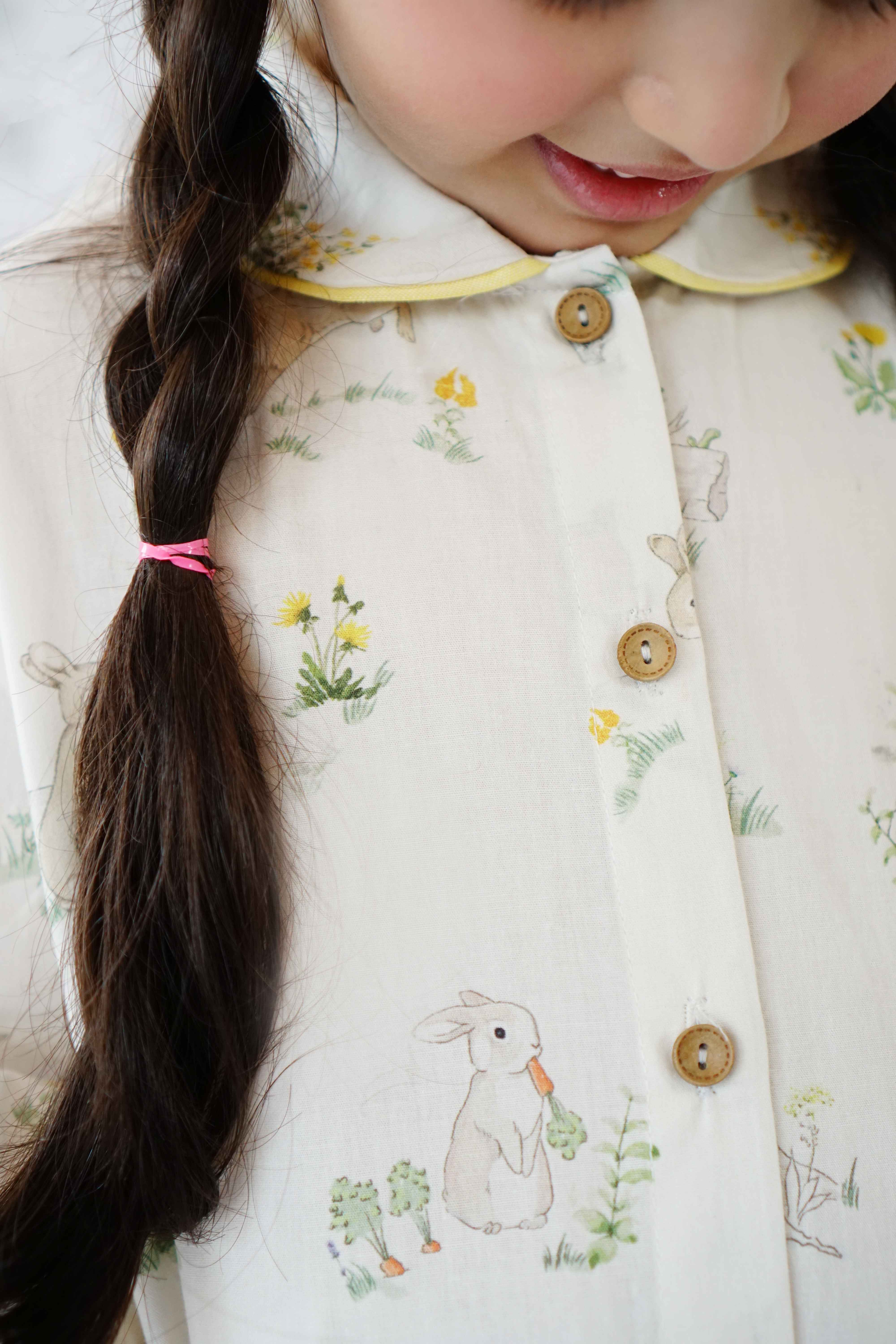 Imagined in a super soft cotton lawn fabric for the warm weather. The shirt has a button-down style featuring a Peterpan collar with pale yellow piping. The shirt also features cute little front pockets adorned with yellow bows! The bottom half of this set is as comfortable as can be in a loose fit as we understand how important it is for youngsters to have pure comfort to come home to after a long day of playing and making mischief – hence comfort is key.