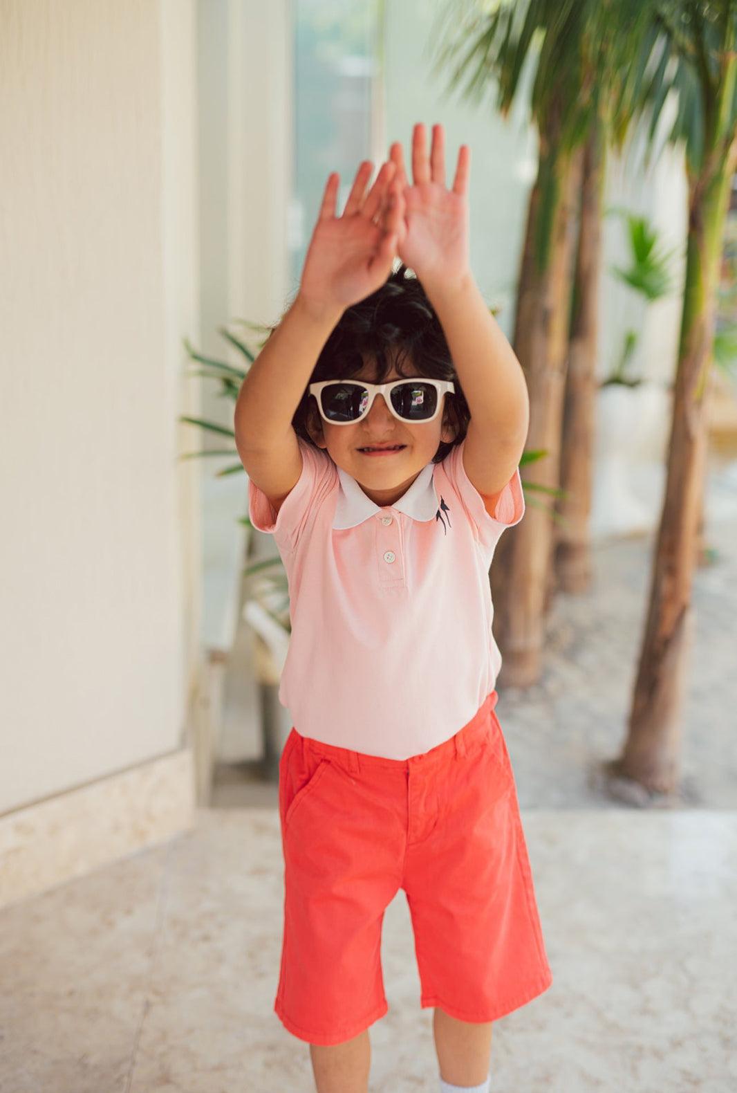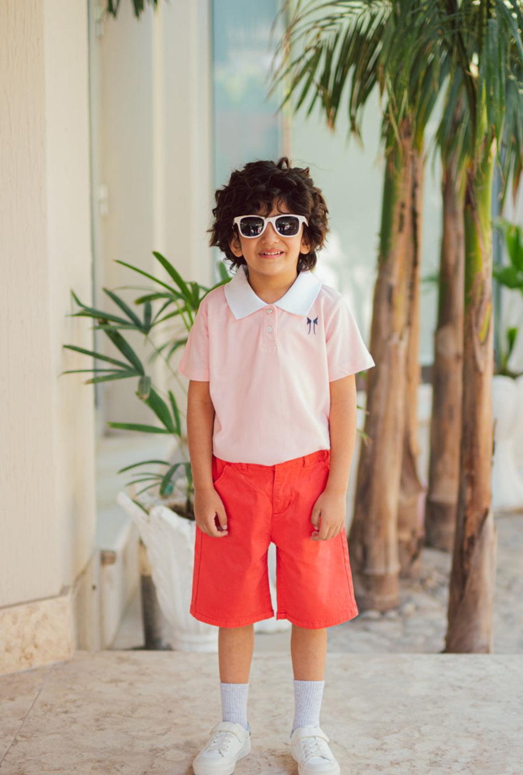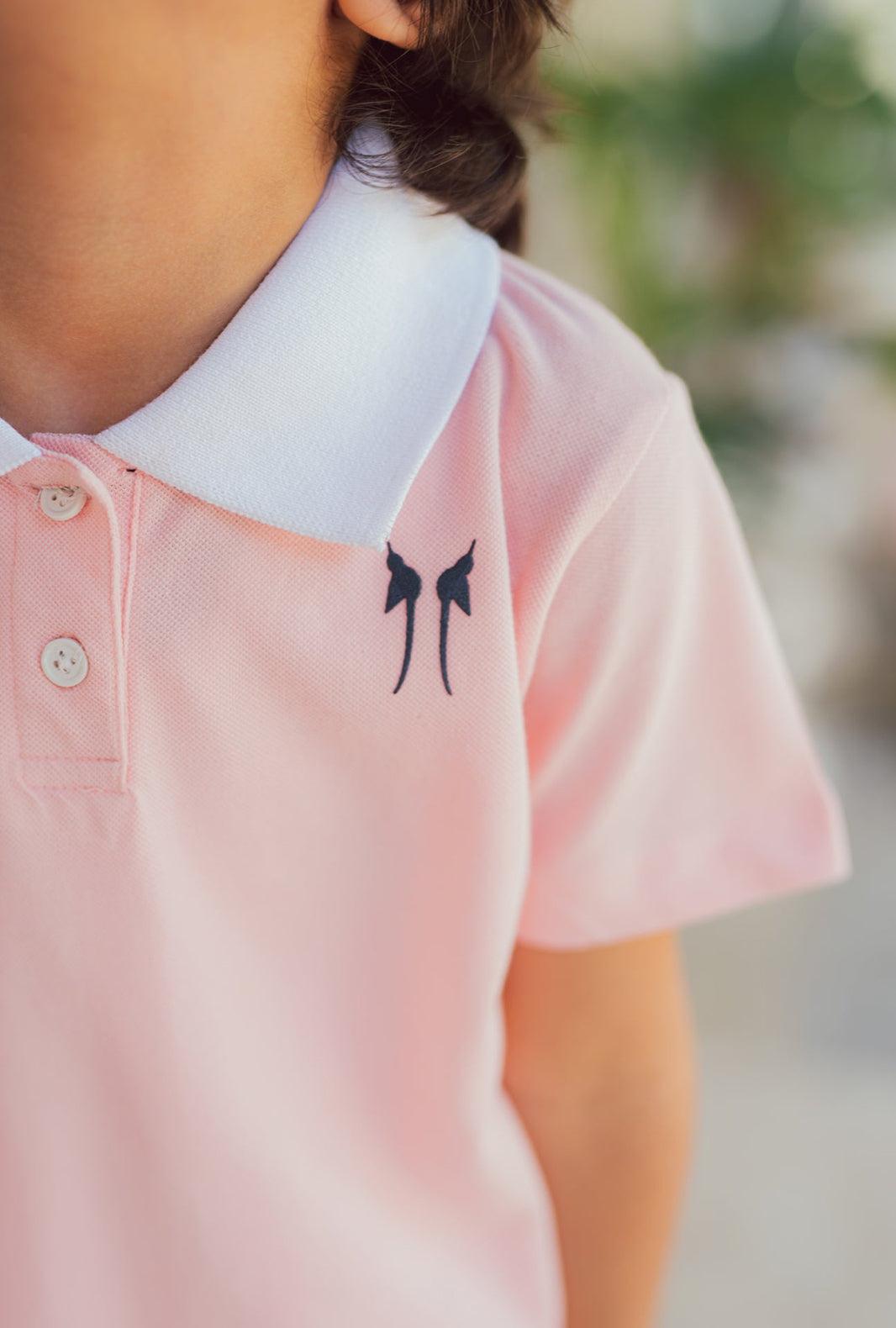 We bring to you this soft Pink Polo Shirt for his Polo match with friends or family get together. Imagined in a pure cotton stretch fabric, complimenting White ribbed Collar, a front button placket, short sleeves, a straight hem with side slits and a contrast embroidered logo at the chest. Perfect for all occasions.