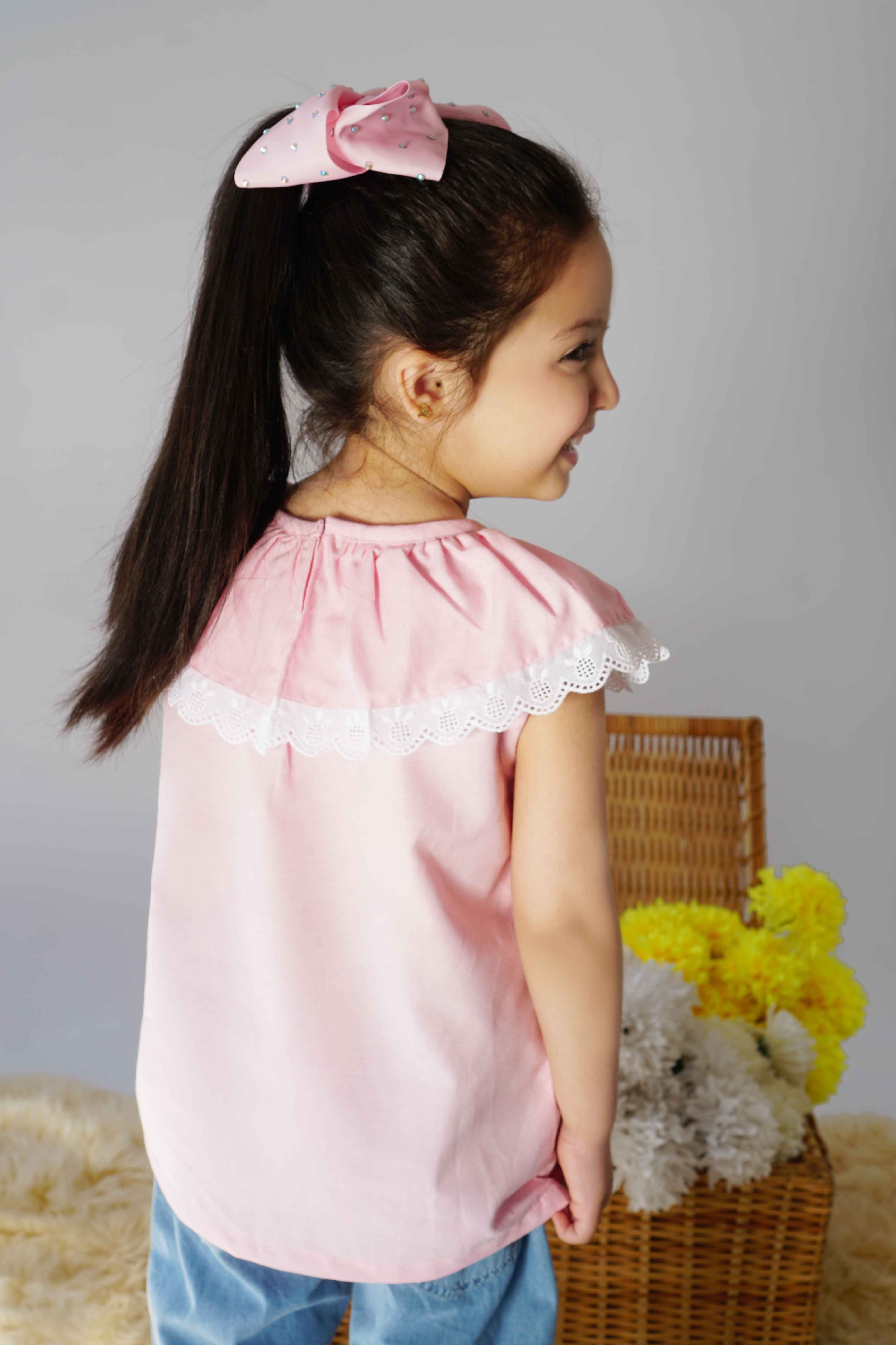 Colour me, Pink! Isn't this such a gorgeous timeless piece with a stunning silhouette? It's imagined in pure and soft cotton chambray in pastel pink and features a fluffy layer of frills along the neckline and sleeves trimmed with delicate white chicken lace. It opens at the back for maximum comfort. Pair this versatile piece with any one of our Sweetheart embroidered jeans to Dazzle everyone!