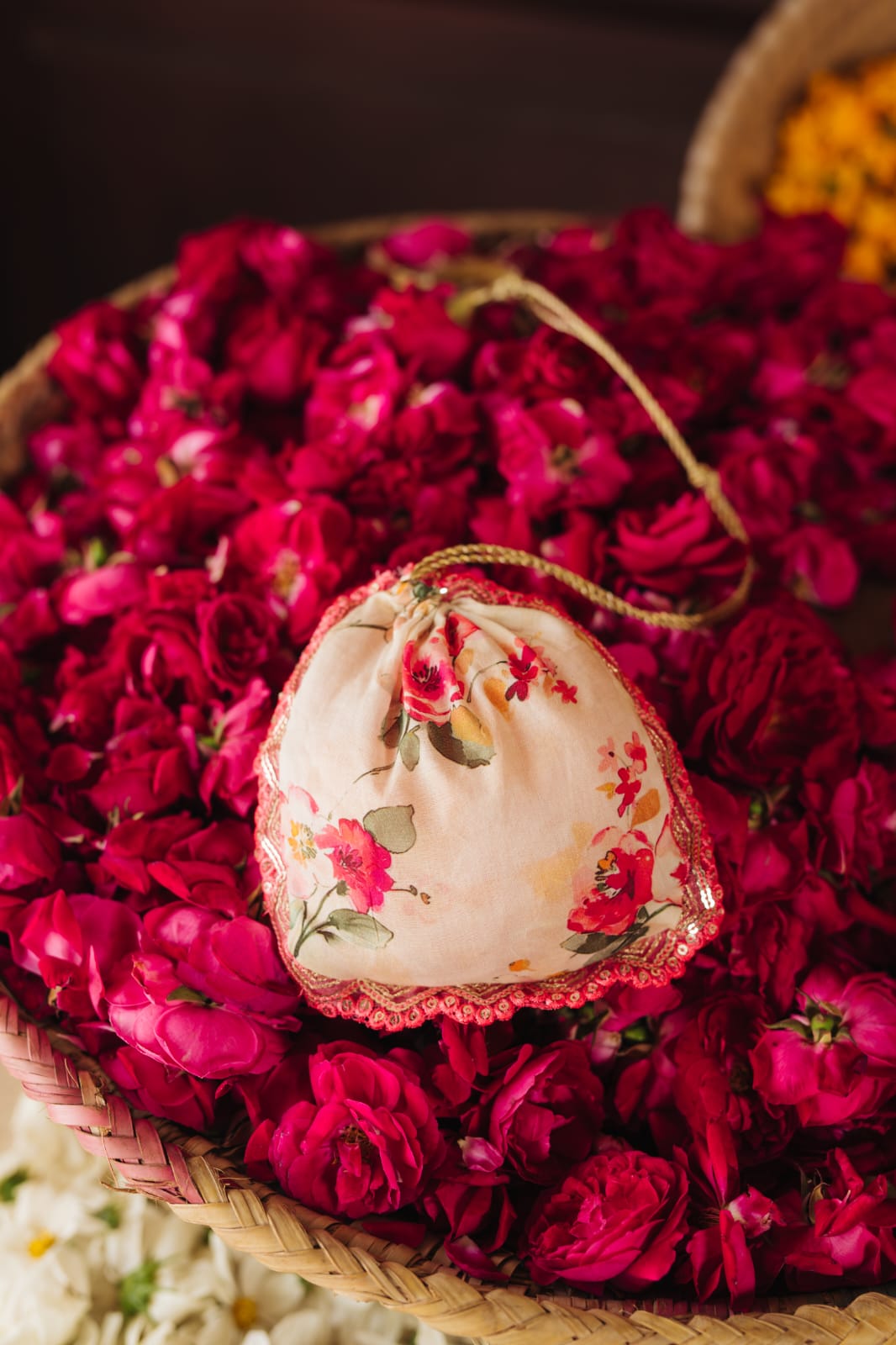 The embellished bodice is adorned with gold, pink, and teal laces, intricately placed on the yoke, and fastened at the top with a front-open design. The elbow-length sleeves feature delicate gathers at the shoulders, creating a soft, elegant drape. Accentuated with glistening pink and gold trims, they add a graceful charm to the ensemble, complementing the intricate embellishments throughout.