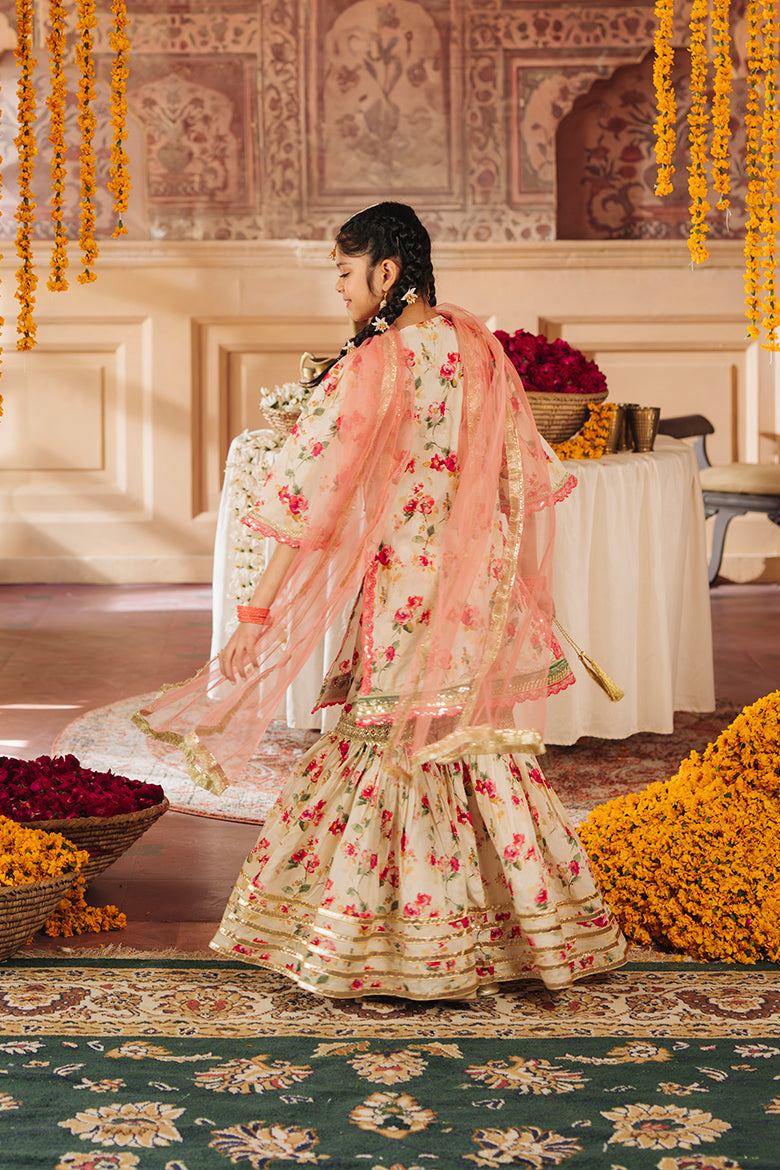 Crafted from cool, breathable lawn fabric, the outfit features a vibrant floral print in shades of pink, peach, and green, set against a soft cream background. The silhouette embraces the traditional gharara style, ensuring a breezy, flowy fit—perfect for the upcoming warm months.