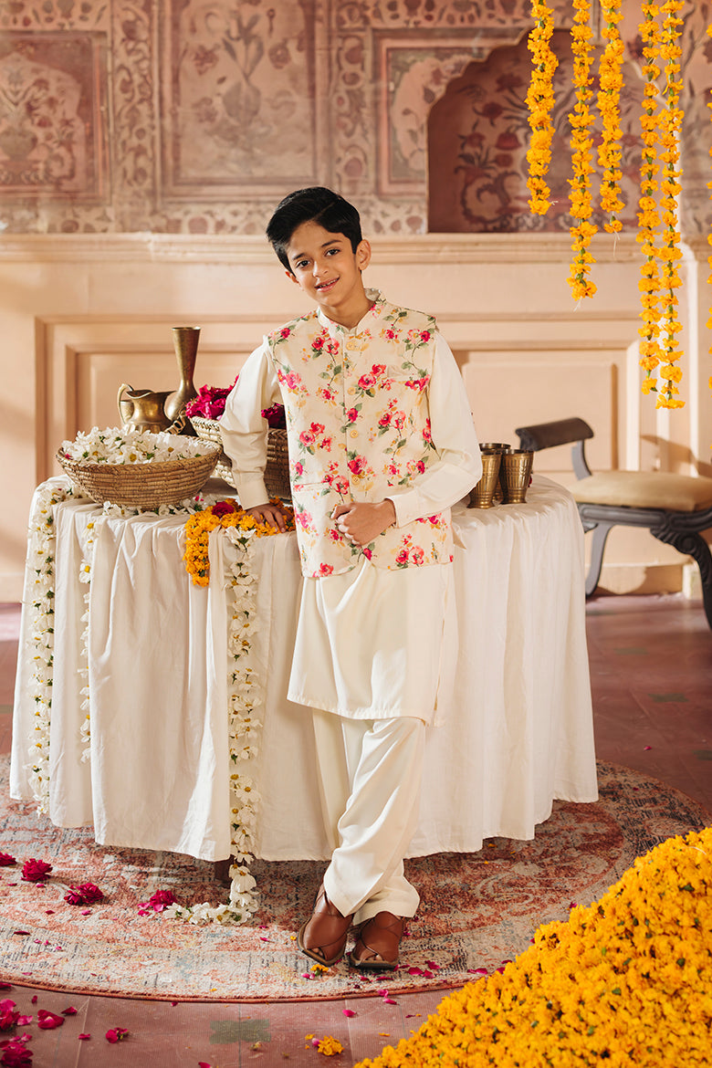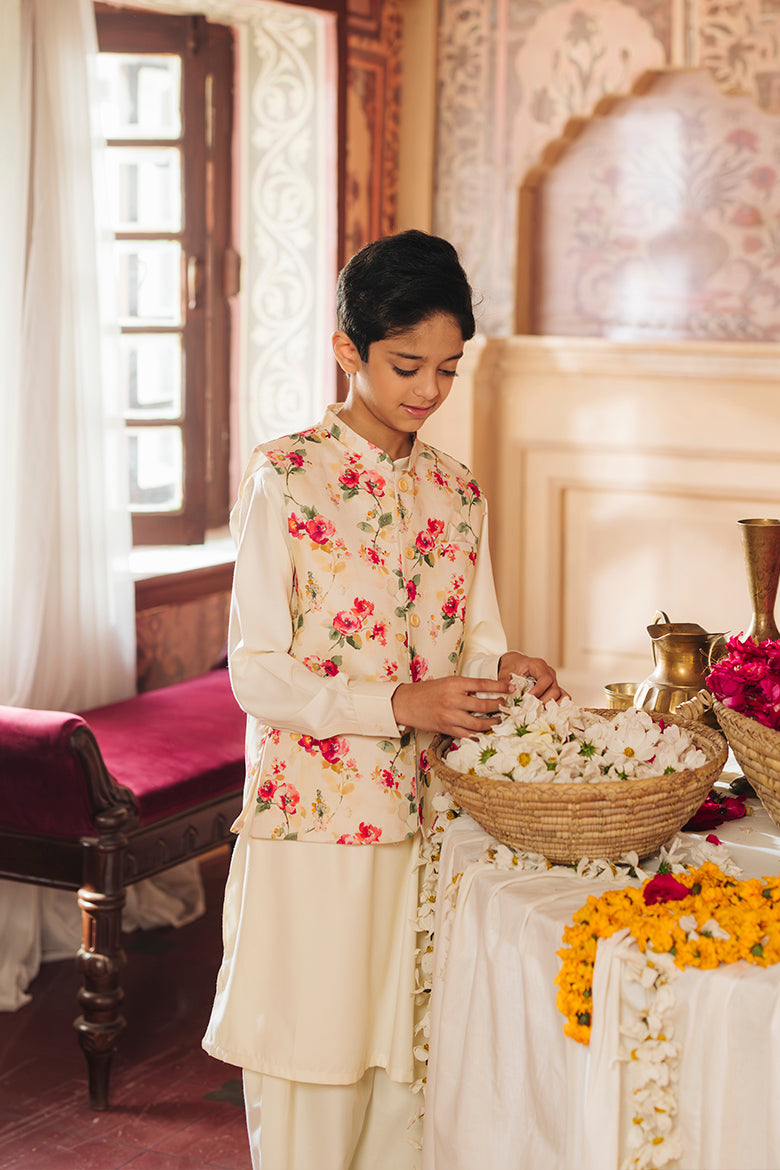 'The envy of the Garden' is how we describe this floral print waistcoat style. Imagined in pure lawn and lined with soft silk, it's indeed a sight for sore eyes. The print features a garden full of pink and peach flowers with lush green leaves all over against a cool cream background. The wooden buttons and silk pocket square adds elegance to the whole look. Ideally, it can be paired with our Cream boski suit or any pastel colour kurta from our collections.