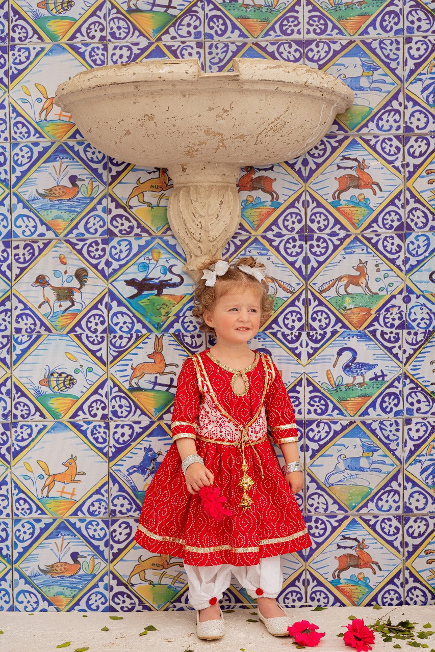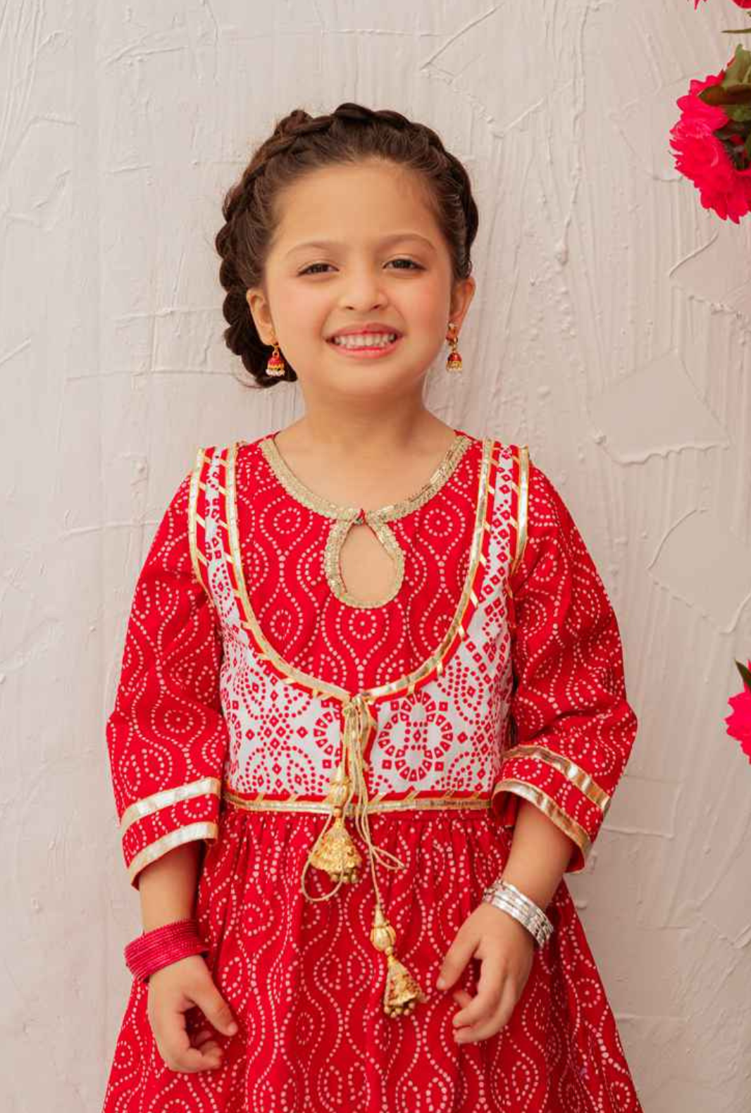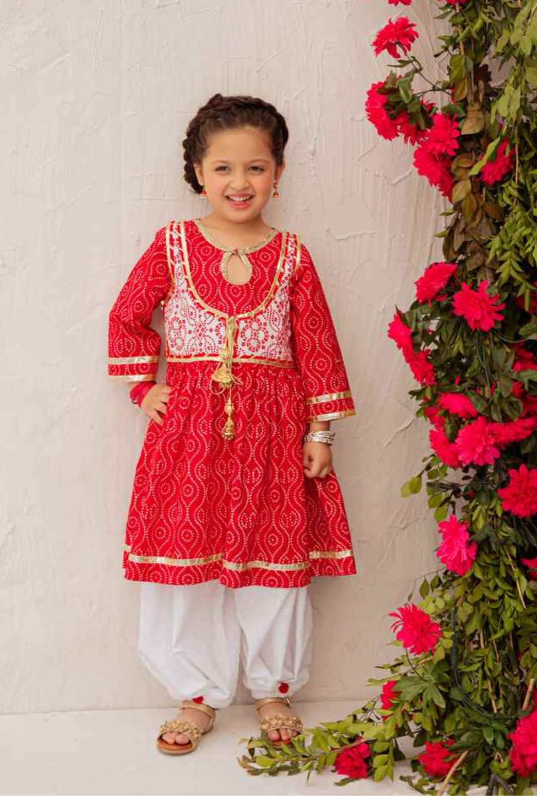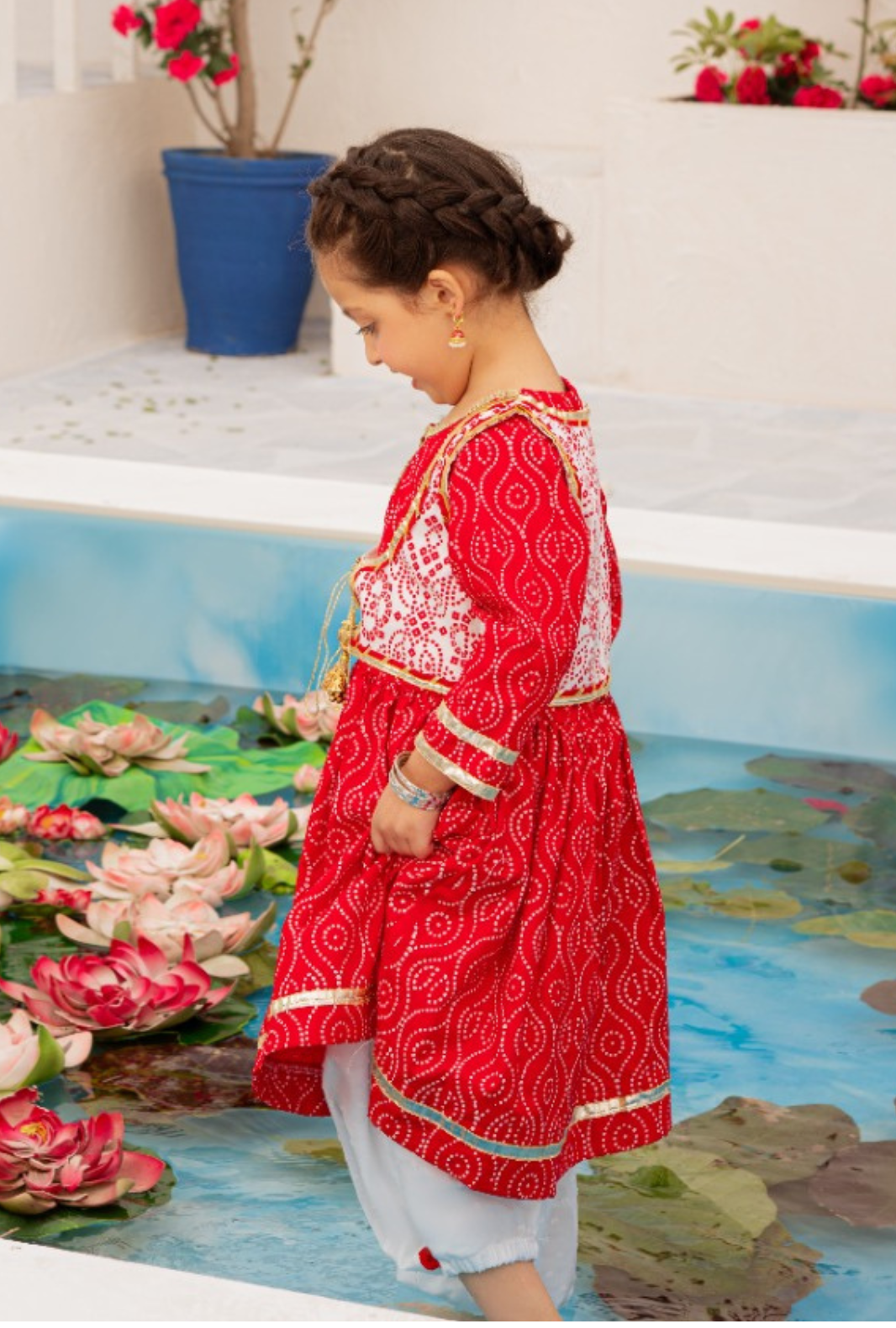This 3 piece ensemble features a bright red and white chunri print crafted in a traditional A-line flowy style shirt with a gathered waistline and comes with a cute little koti that features a white base and red chunri print. The fabric is pure cotton-lawn, accented with Gotta and traditional chatta Patti laces and tassels all over the shirt and koti. This adorable look is completed with a cute patiala style shalwar in white cotton brosha fabric with contrasting red pompoms on the hem. Match her stunning outfit with her brothers this Eid!