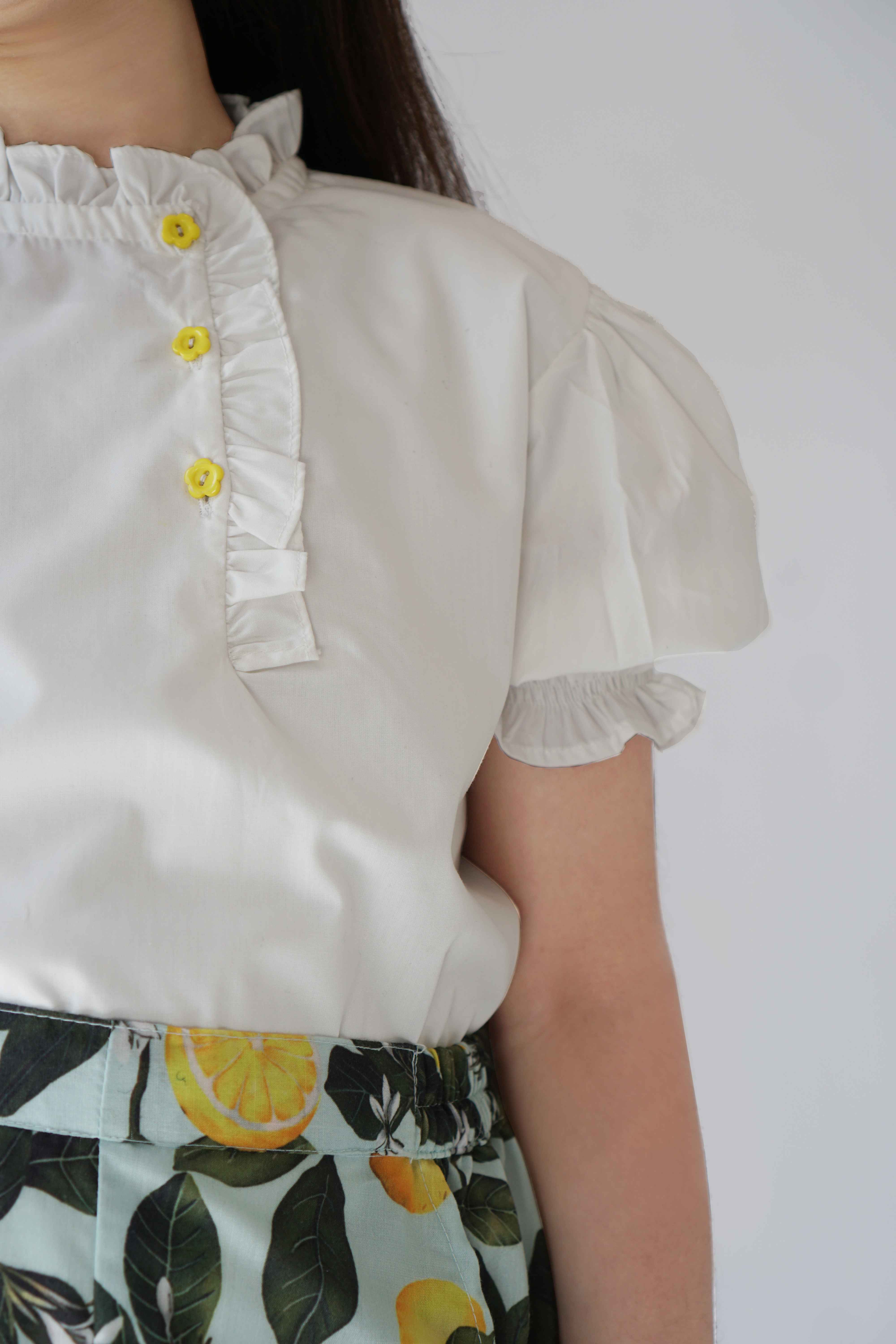 The frilly collar has always held magical appeal, with the rounded neckpiece famously taken from the enchanting tale of cinderalla and many others, we've applied our own version to this classical blouse, with a sprinkling of yellow tulip buttons on the front for a delightful finish. Imagined in pure white lawn, this summery style features puffy half sleeves with frills around the collar and sleeves. Pair it with anyone of our bottom separates!