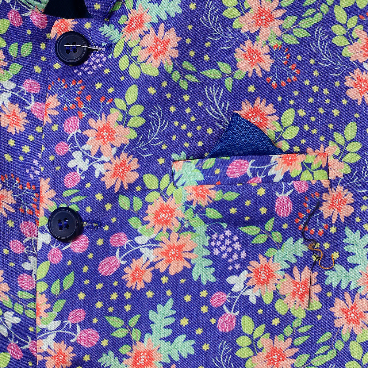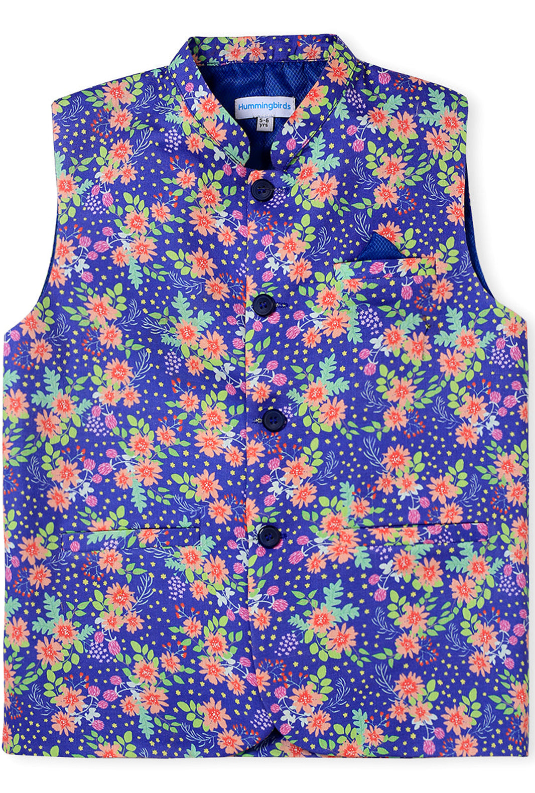 Fit for a Prince! We present to you our gorgeous Wisteria Bloom floral print waistcoat. It's imagined in a lively navy blue printed cotton lawn fabric and features a lovely floral print. It is accented with dark blue buttons and lined with fine silk. Pair it with our Navy blue/ White or Lilac kurta and let him shine like the star he is!