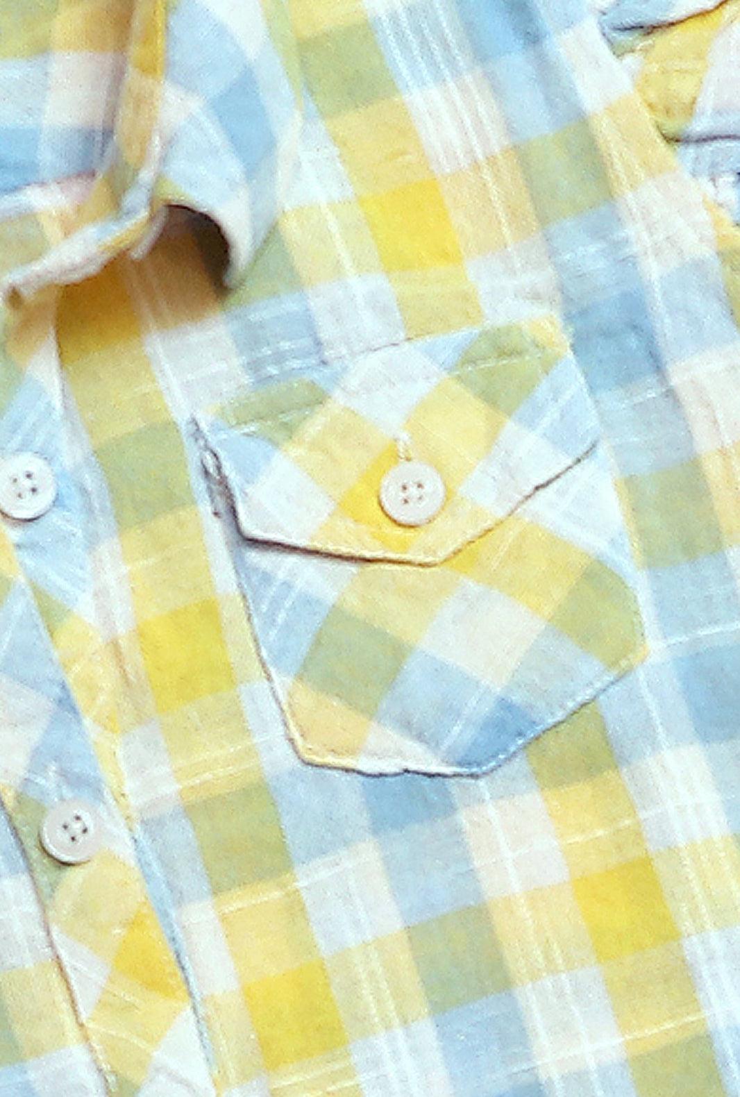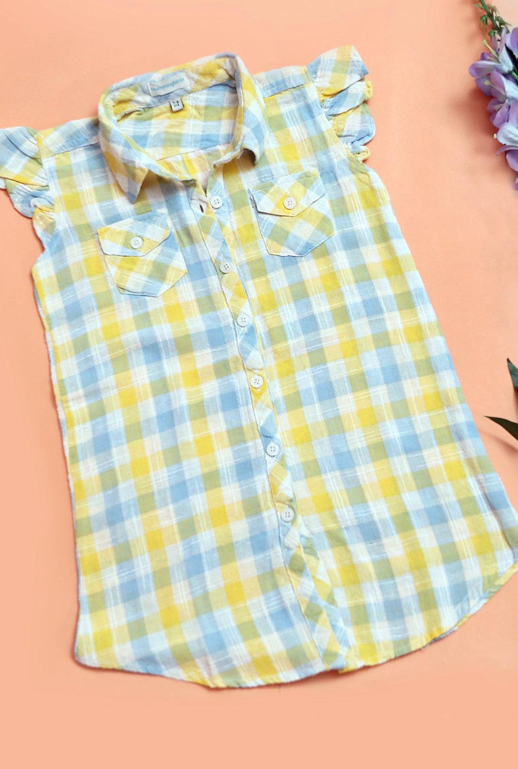 This one's a keeper! Stitched to perfection, this yellow and blue check print top comes in a button down style and features cute little ruffled shoulders and pockets to complete the look. This versatile top will look fabulous with tights, jeans, a skirt or shorts!